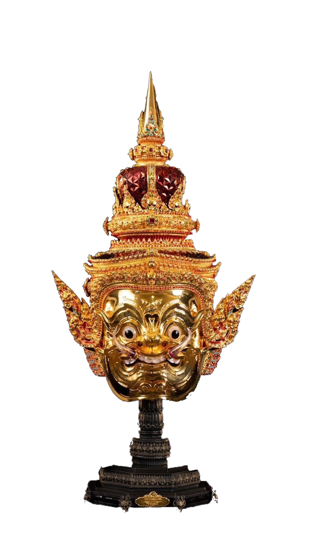 ท้าวเวสสุวรรณ หล่อด้วยโลหะทองเหลือง(สัมฤทธิ์)ประกอบลวดลายโลหะชุบทองลงยาประดับพลอยแท้ ฝังกระจกเกรียบลายดอกจอกยกดอกสีแดงส้ม ตา ฟัน และเขี้ยวเจียระไนจากเพชรสังเคราะห์ งดงามด้วยฝีมือ ทางเชิงช่างที่วิจิตรบรรจงสร้าง